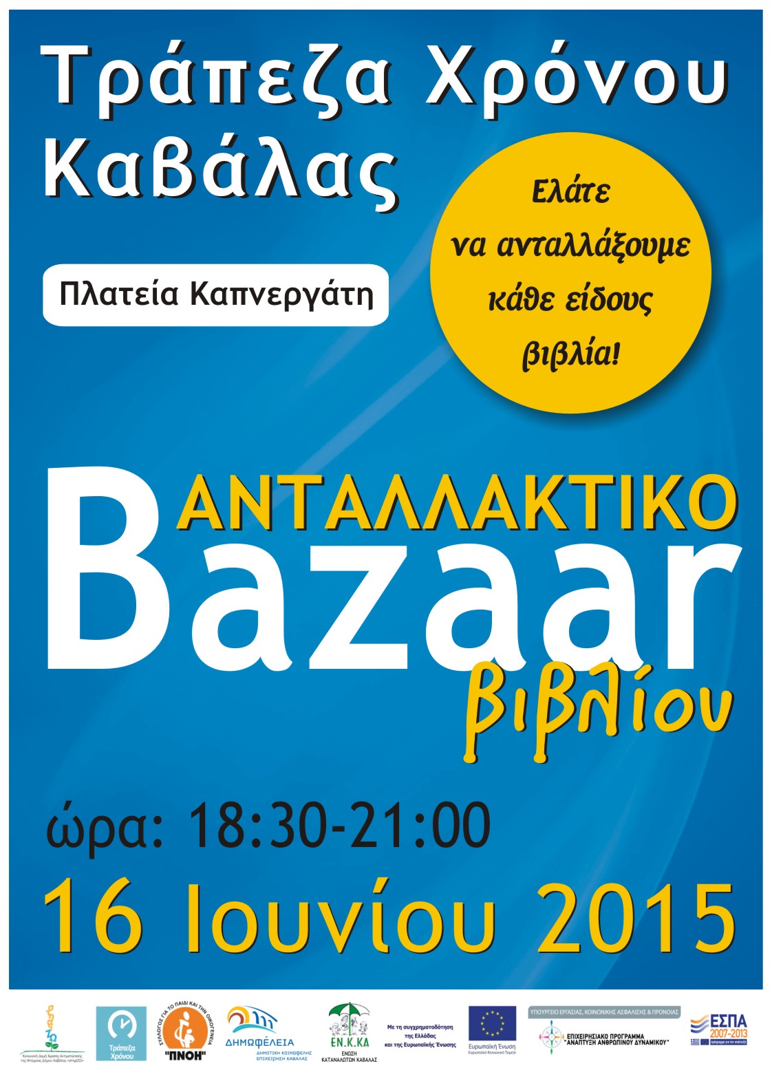 Η Τράπεζα Χρόνου Καβάλας του προγράμματος Κοινωνικές Δομές Άμεσης Αντιμετώπισης της Φτώχειας «Στηρίζω» στο Δήμο Καβάλας, σας προσκαλεί στο « Ανταλλακτικό Βazaar Βιβλίου» που διοργανώνει στην Πλατεία Καπνεργάτη την Τρίτη 16 Ιουνίου στις 18:30-21:00.