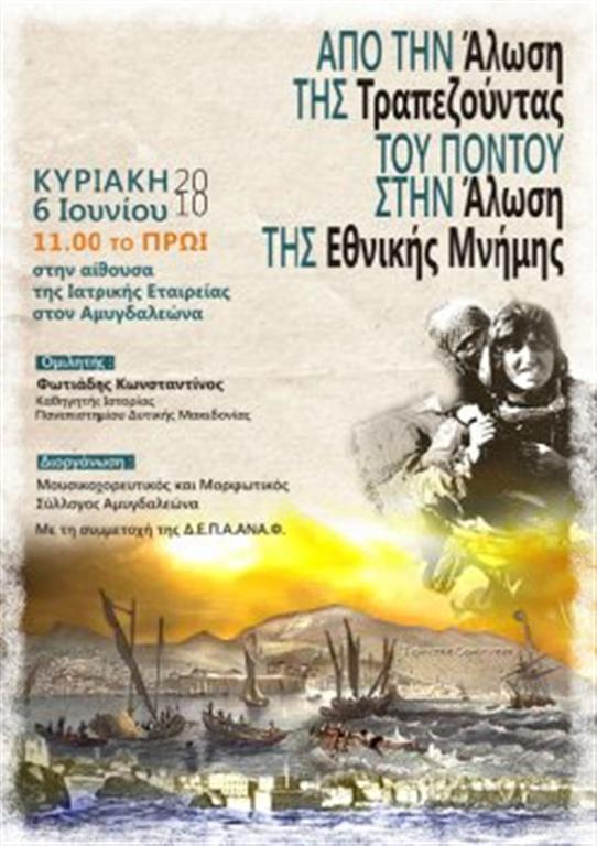 «Από την Άλωση της Τραπεζούντας του Πόντου, Στην Άλωση της Εθνικής Μνήμης», Κυριακή 06 Ιουνίου 2010, ώρα 11 το πρωί, αίθουσα συνεδριάσεων Ιατρικής Εταιρείας στον Αμυγδαλεώνα.
