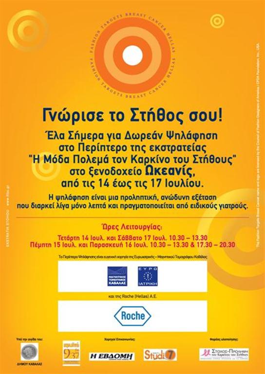 Περιμένουμε όλες τις γυναίκες στο Περίπτερο Ψηλάφησης του «Στόχου», που θα βρίσκεται στο ξενοδοχείο “ΩΚΕΑΝΙΣ” από την Τετάρτη 14 έως και το Σάββατο 17 Ιουλίου. Καθημερινά, ειδικοί γιατροί του Ιατρικού Συλλόγου Καβάλας θα σας προσφέρουν δωρεάν την εξέταση της ψηλάφησης και θα σας ενημερώνουν για τους τρόπους πρόληψης και έγκαιρης διάγνωσης του Καρκίνου του Στήθους.