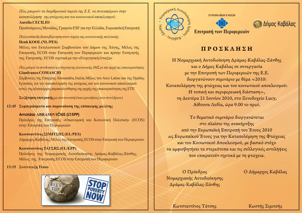 Η Νομαρχιακή Αυτοδιοίκηση Δράμας-Καβάλας-Ξάνθης και ο Δήμος Καβάλας σε συνεργασία με την Επιτροπή Περιφερειών της ΕΕ διοργανώνουν σεμινάριο με θέμα :”2010: Καταπολέμηση της φτώχειας και του κοινωνικού αποκλεισμού: η τοπική και περιφερειακή διάσταση”.
