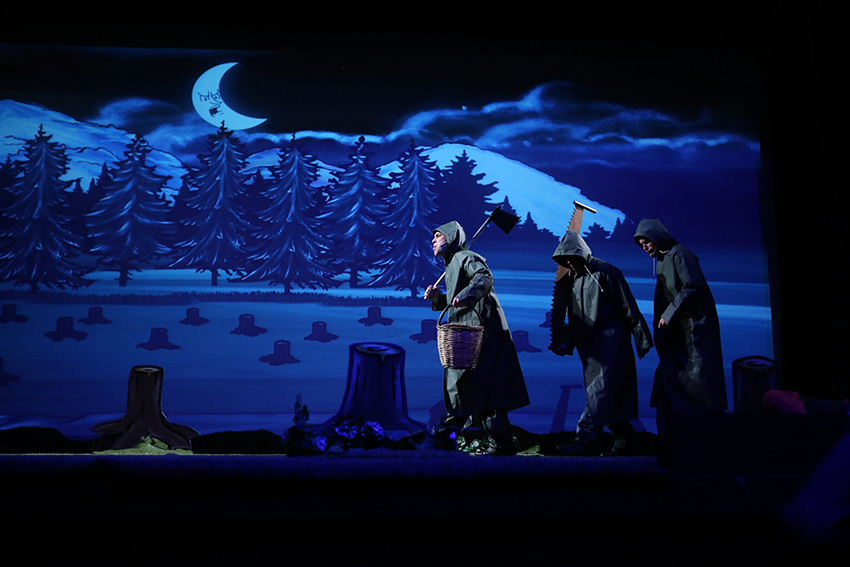 Τα σκηνικά της παράστασης εµπλουτίζονται µε ψηφιακές προβολές υψηλής ανάλυσης από κινούµενα σχέδια (3D Animation), που βασίζονται στις αυθεντικές εικόνες του βιβλίου όπως ακριβώς τις σχεδίασε ο Ζαχαρίας Παπαντωνίου. Πρώτη φορά σε οικογενειακή παράσταση ψηφιακές προβολές κινούμενων σχέδιων συγχρονίζονται και αλληλεπιδρούν µε την κίνηση των ηθοποιών, συνθέτοντας ένα υπέροχο βουκολικό περιβάλλον, µε δάσος, άστρα και ουρανό.
