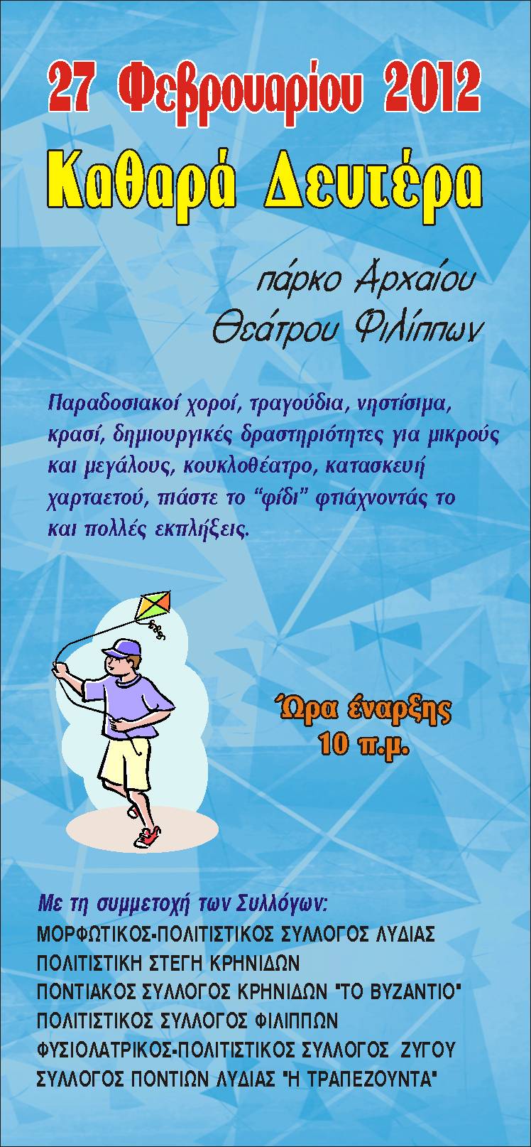 Ο περιβάλλων χώρος του αναψυκτηρίου στο αρχαίο θέατρο Φιλίππων, θα είναι το επίκεντρο των φετινών εκδηλώσεων της Καθαρής Δευτέρας στο Δήμο Καβάλας. Με απόφαση της διοίκησης του Δήμου, λοιπόν, η δημοτική κοινωφελής επιχείρηση «Δημωφέλεια» και οι πολιτιστικοί σύλλογοι των δημοτικών ενοτήτων Καβάλας και Φιλίππων, ετοιμάζουν ένα πρόγραμμα το οποίο θα περιλαμβάνει παραδοσιακούς χορούς και τραγούδια, διάφορες δημιουργικές δραστηριότητες για μικρούς και μεγάλους, αθλοπαιδιές, κουκλοθέατρο, κατασκευή χαρταετών, κυνήγι κρυμμένου θησαυρού και, φυσικά, κρασί με τα παραδοσιακά νηστίσιμα εδέσματα. Οι πολίτες θα έχουν την ευκαιρία, επίσης, να πετάξουν τους χαρταετούς που θα κατασκευάσουν, ή που θα έχουν φέρει μαζί τους έτοιμους. Οι εκδηλώσεις θα αρχίσουν από τις 10 το πρωί και θα συνεχιστούν έως το απόγευμα. Τις επόμενες ημέρες θα γίνει διαφημιστική προβολή στα τοπικά Μέσα Ενημέρωσης, με σκοπό την ενημέρωση των δημοτών.