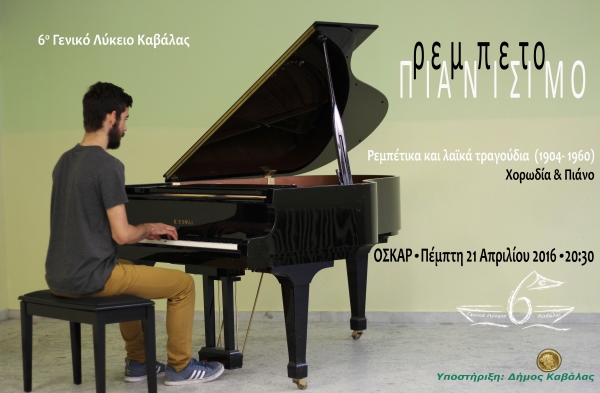 Το 6ο Γενικό Λύκειο Καβάλας, την προσεχή Πέμπτη 21-4-2016, στις 20:30, στο κινηματοθέατρο ΟΣΚΑΡ, παρουσιάζει τη μουσική παράσταση «ΡΕΜΠΕΤΟΠΙΑΝΙΣΙΜΟ», με ρεμπέτικα και λαϊκά τραγούδια της περιόδου 1904 – 1960.