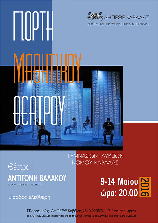 Το ΔΗ.ΠΕ.ΘΕ. Καβάλας και η Διεύθυνση Δευτεροβάθμιας Εκπαίδευσης Καβάλας θεσμοθετούν την πρώτη Γιορτή Μαθητικού Θεάτρου για Γυμνάσια και Λύκεια που θα διεξαχθεί στην πόλη μας από τη Δευτέρα 9 έως το Σάββατο 14 Μαΐου 2016 στο θέατρο Αντιγόνη Βαλάκου.