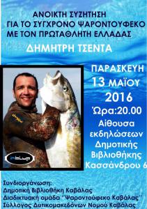 Η Δημοτική Βιβλιοθήκη Καβάλας, η διαδικτυακή ομάδα Ψαροντούφεκο Καβάλας και ο σύλλογος Δυτικομακεδόνων νομού Καβάλας διοργανώνουν ανοικτή συζήτηση με θέμα «Το σύγχρονο ψαροντούφεκο», με τον πρωταθλητή Ελλάδας και παγκόσμιο τριταθλητή Δημήτρη Τσέντα.