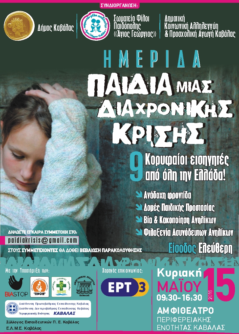 Το Σωματείο Φίλοι Παιδόπολης «Άγιος Γεώργιος» Καβάλας, συνδιοργανώνει με το Δήμο Καβάλας και το ΝΠΔΔ “Δημοτική Κοινωνική Αλληλεγγύη & Προσχολική Αγωγή Καβάλας” μια πολύ σημαντική Ημερίδα για την Κοινωνική Προστασία Ανηλίκων, με τίτλο «Παιδιά μιας Διαχρονικής Κρίσης», την Κυριακή 15 Μαΐου στο Αμφιθέατρο της Π.Ε. Καβάλας, από τις 9,30 πμ (ώρα προσέλευσης) έως τις 16,30 (ώρα λήξης).