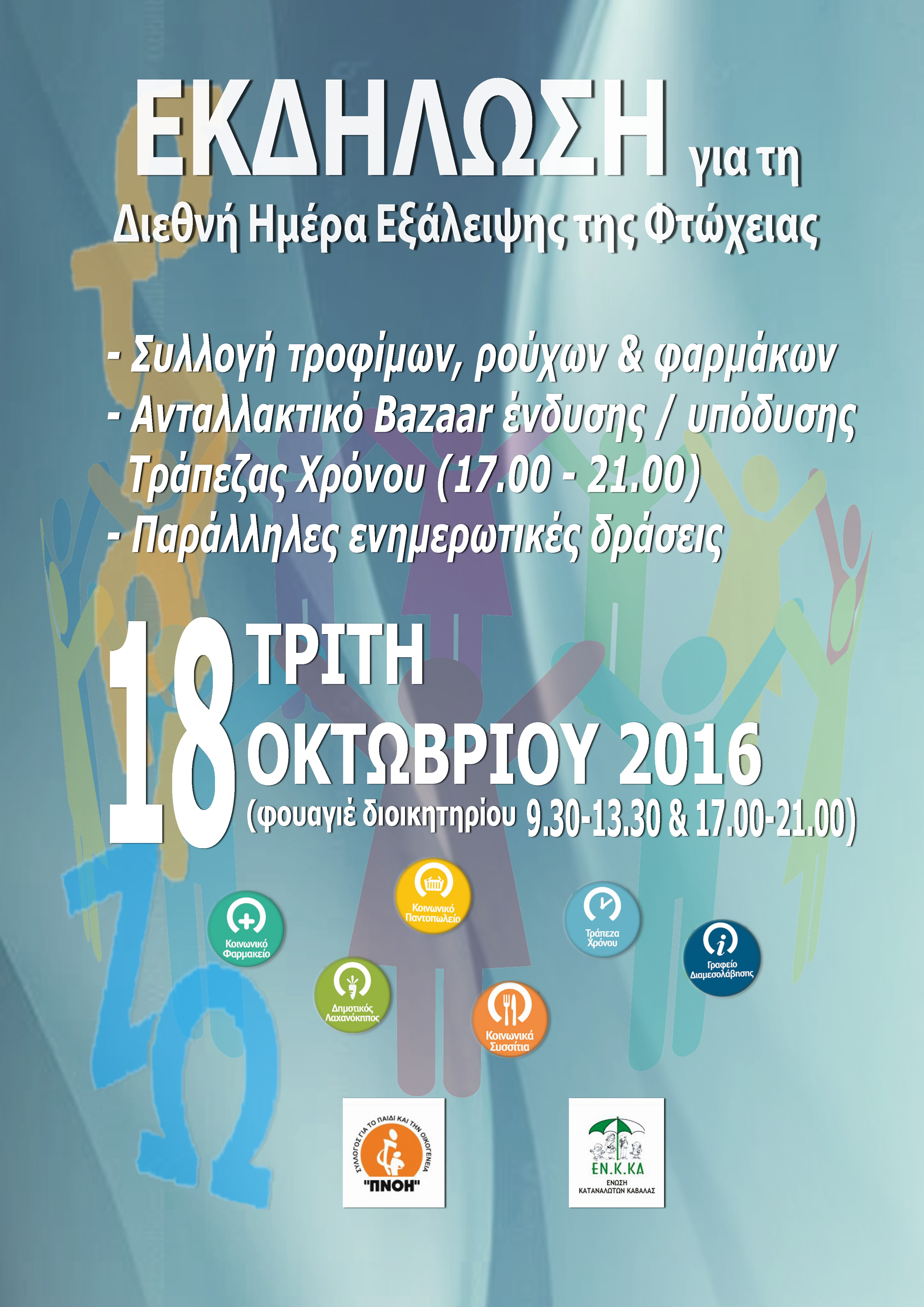 O Σύλλογος για το Παιδί και την Οικογένεια “ΠΝΟΗ”, με όλες τις δομές του Προγράμματος Κοινωνικές Δομές Άμεσης Αντιμετώπισης της Φτώχειας “ΣΤΗΡΙΖΩ” του Δήμου Καβάλας , με αφορμή τη Διεθνή Ημέρα για την Εξάλειψη της Φτώχειας, διοργανώνει εκδήλωση την Τρίτη 18 Οκτωβρίου 2016, στο χώρο του Φουαγιέ του Αμφιθεάτρου του Διοικητηρίου, κατά τις ώρες 9.30 π.μ. – 13.30 μ.μ. και 17.00 μ.μ. – 21.00 μ.μ..