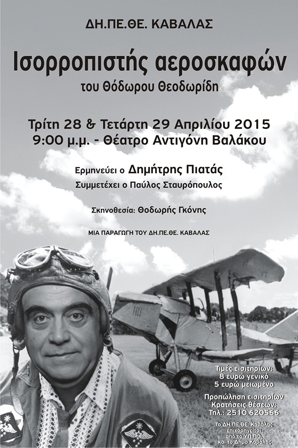 Συνεχίζονται στην Αθήνα, οι πρόβες του θεατρικού αναλογίου «Ισορροπιστής αεροσκαφών» του Θόδωρου Θεοδωρίδη, που έχει προγραμματιστεί να παρουσιαστεί στην Καβάλα, στο θέατρο Αντιγόνη Βαλάκου την Τρίτη 28 και την Τετάρτη 29 Απριλίου στις 9 το βράδυ.