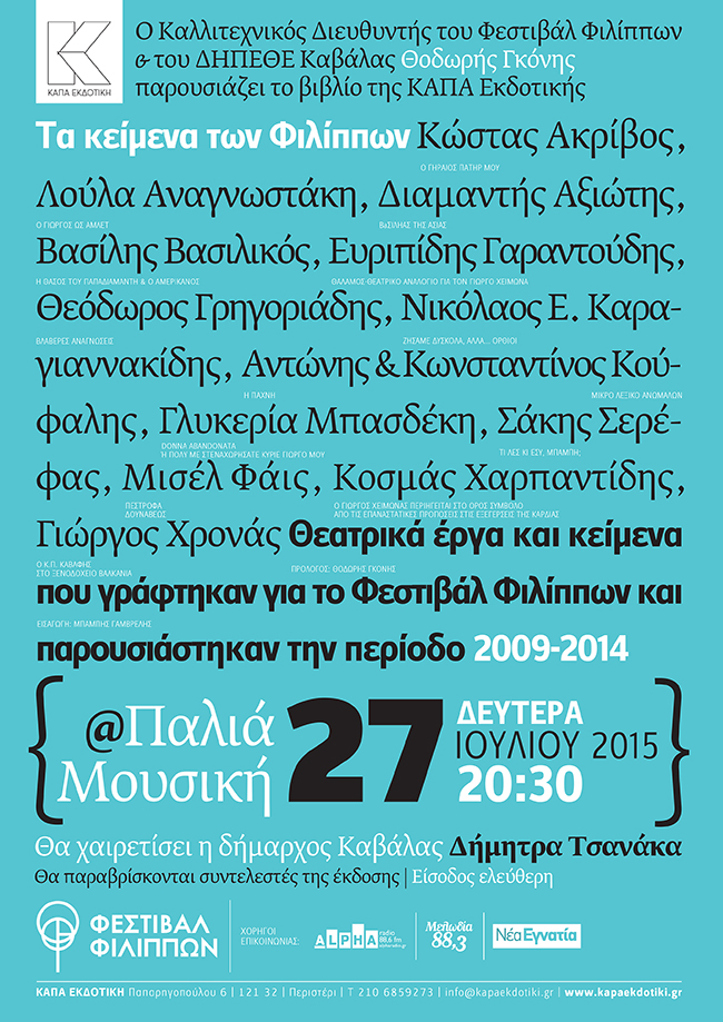 Το Φεστιβάλ Φιλίππων σε συνεργασία με την ΚΑΠΑ Εκδοτική, παρουσιάζουν το βιβλίο «Τα κείμενα των Φιλίππων» που κυκλοφορεί στη Σειρά «Σύγχρονο Ελληνικό Θέατρο» και συγκεντρώνει σε έναν τόμο θεατρικά έργα και κείμενα που γράφτηκαν για το Φεστιβάλ Φιλίππων και παρουσιάστηκαν την περίοδο 2009-2014.