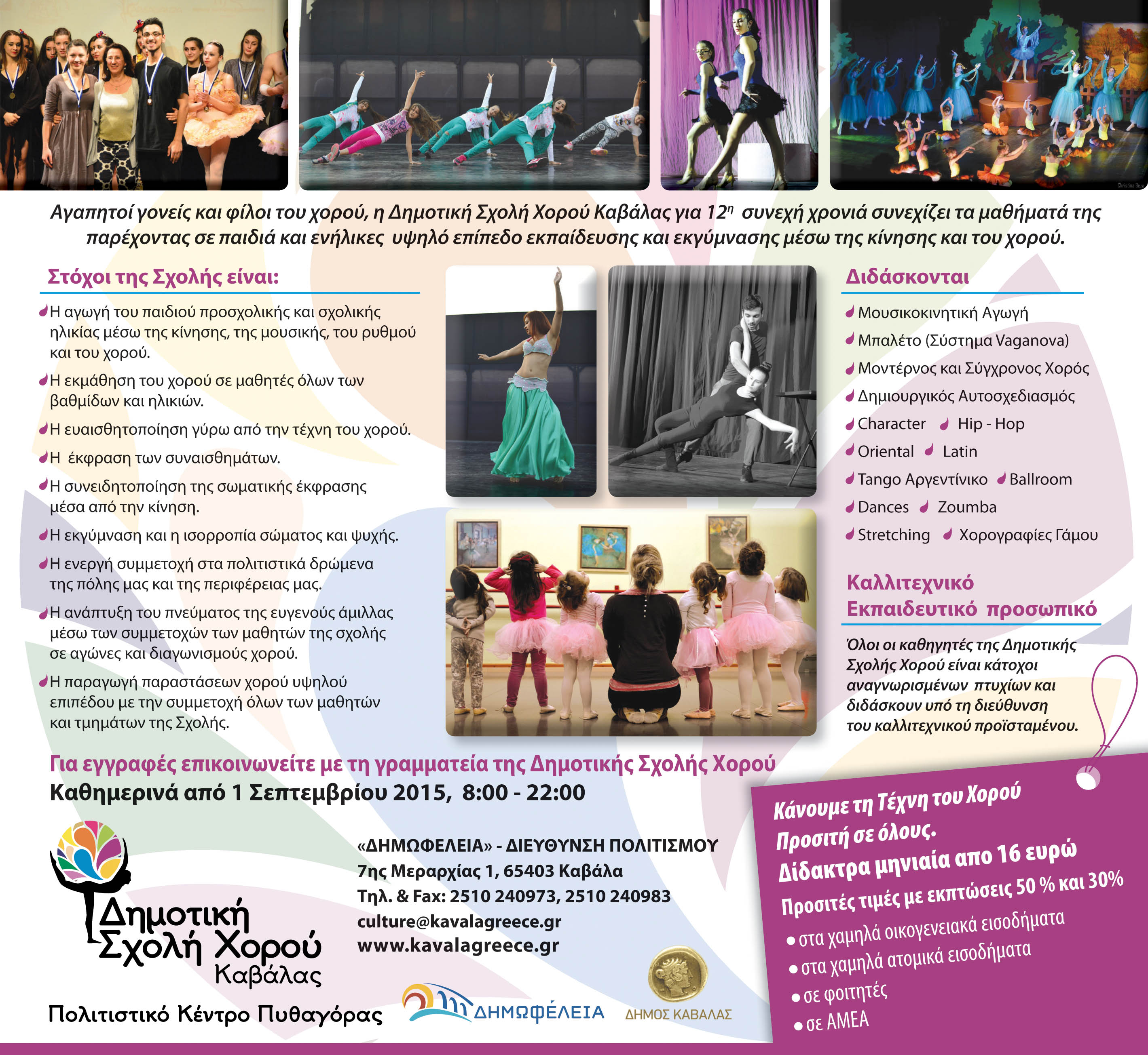 Σας περιμένουμε για την εγγραφή σας στη Δημοτική Σχολή Χορού Καβάλας καθημερινά 8:00 – 22:00 από 1 Σεπτεμβρίου, στο Πολιτιστικό Κέντρο «Πυθαγόρας». Τηλέφωνα για πληροφορίες : 2510 240983, 240973.