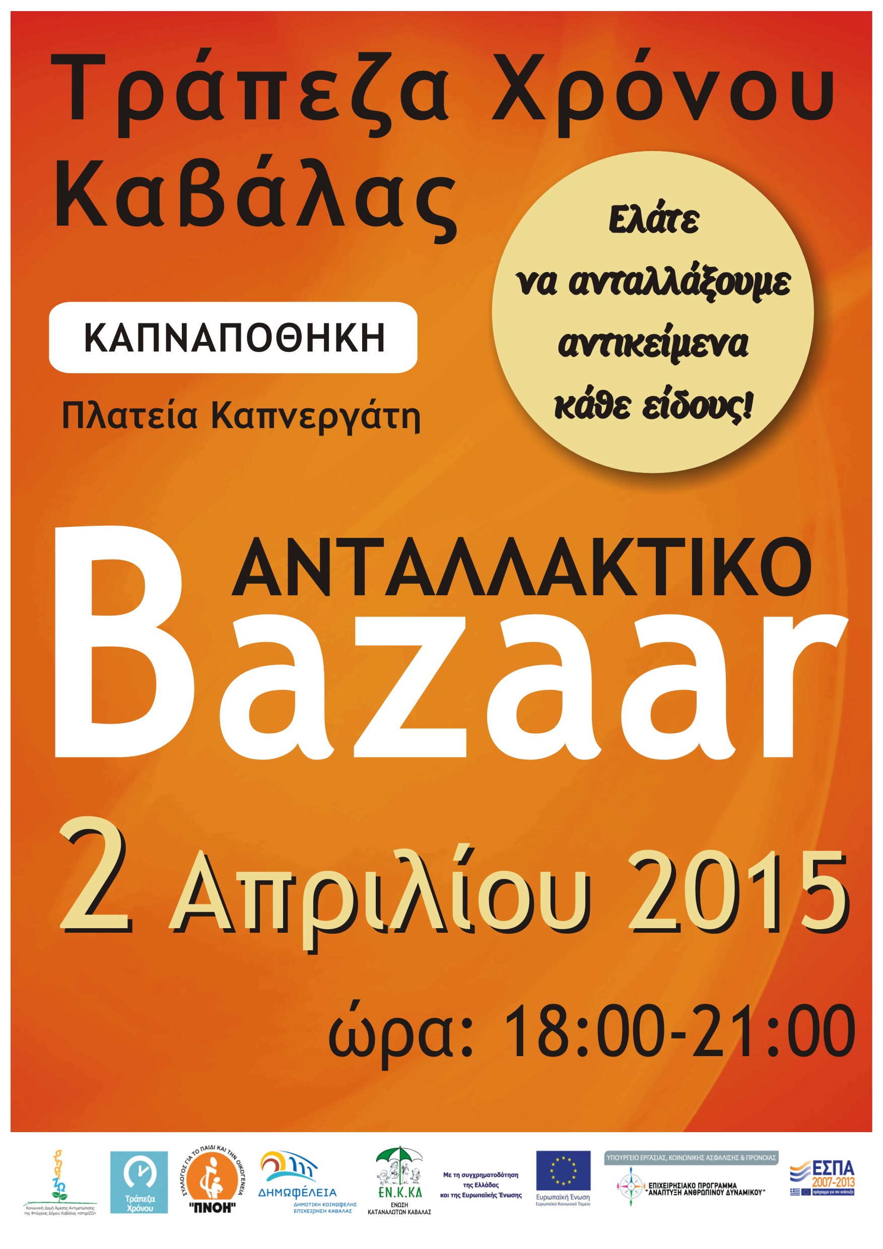 Η Τράπεζα Χρόνου Καβάλας του προγράμματος Κοινωνικές Δομές Άμεσης Αντιμετώπισης της Φτώχειας «Στηρίζω» στο Δήμο Καβάλας, σας προσκαλεί στο «Ανταλλακτικό Βazaar» που διοργανώνει στην Καπναποθήκη (Πλατεία Καπνεργάτη), την Πέμπτη 2 Απριλίου 2015 και ώρα 18:00 – 21:00.