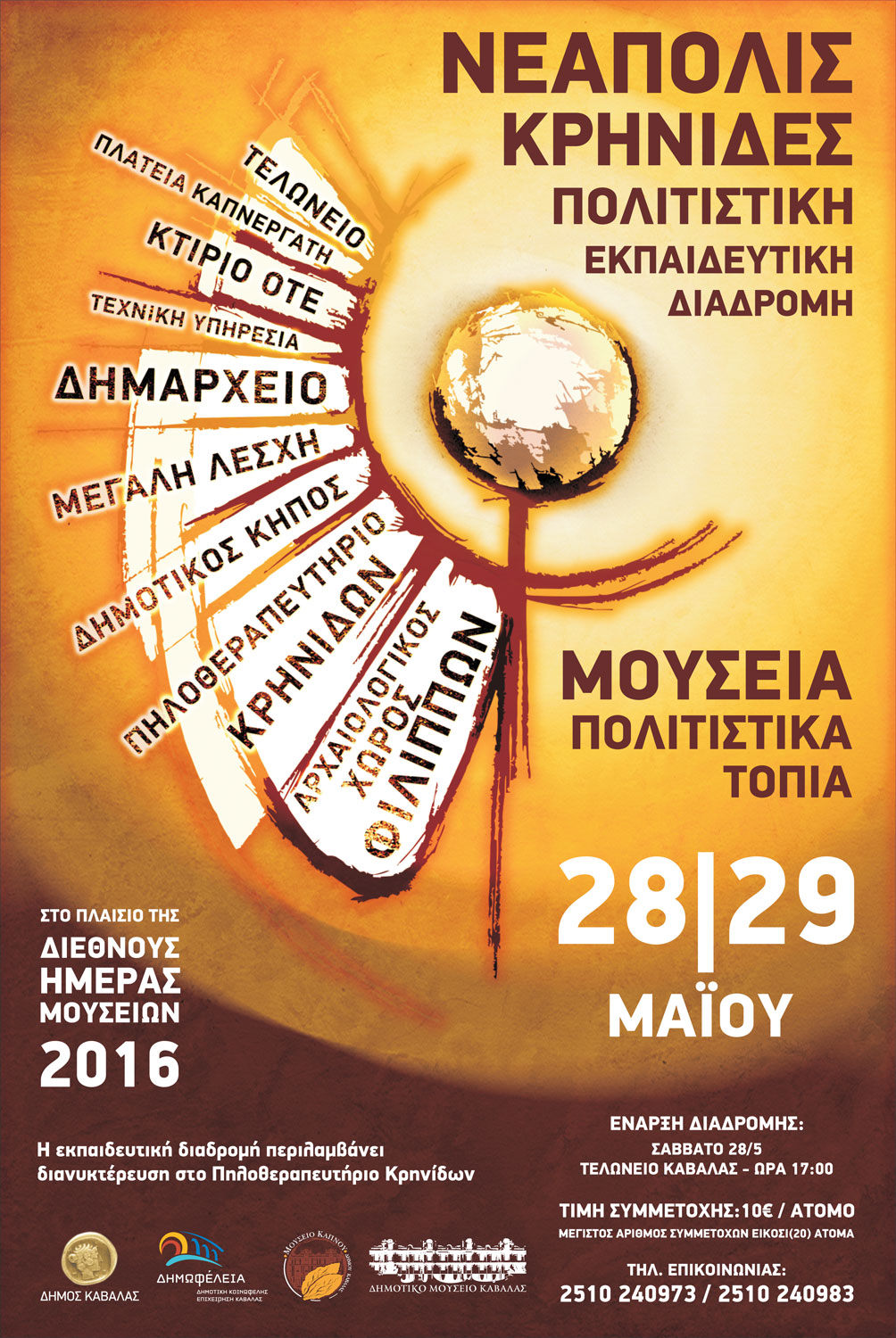 Ο Δήμος Καβάλας, η Δημοτική Κοινωφελής Επιχείρηση Καβάλας «Δημωφέλεια», το Δημοτικό Λαογραφικό Μουσείο Καβάλας και το Μουσείο Καπνού του Δήμου Καβάλας συμμετέχουν στους εορτασμούς για τη Διεθνή Ημέρα Μουσείων 2016 με τίτλο: «Μουσεία και Πολιτιστικά Τοπία. Στις 28 και 29 Μαΐου 2016 διοργανώνεται πολιτιστική εκπαιδευτική διαδρομή «Νεάπολις- Κρηνίδες», ένα ταξίδι στο ιστορικό παρελθόν της πόλης και της περιοχής. Έναρξη διαδρομής: Σάββατο 28 Μαΐου, στις 17:00 (Τελωνείο Καβάλας). Σταθμοί διαδρομής: (Σάββατο 28/5) Πλατεία Καπνεργάτη, κτίριο ΟΤΕ, κτίριο Τεχνικών Υπηρεσιών, Δημαρχείο, Μεγάλη Λέσχη, Δημοτικός Κήπος, μετακίνηση με λεωφορείο και διανυκτέρευση στο Πηλοθεραπευτήριο Κρηνίδων. (Κυριακή 29/5) Αρχαιολογικός χώρος Φιλίππων, Ντίκιλι Τας, κεντρική πλατεία Κρηνίδων, επιστροφή στην Καβάλα. Μέγιστος αριθμός συμμετοχών: 20 άτομα. Συμμετοχή: 10 €. Πληροφορίες- εγγραφές στο Πολιτιστικό Κέντρο «Πυθαγόρας» (Δ/νση Πολιτισμού «Δημωφέλεια», 7ης Μεραρχίας 1) και στα τηλέφωνα επικοινωνίας: 2510 240983 και 2510 240973 (Παρ. 6/5: 8:00-15:30 και από Δευ.9/5, καθημερινά: 8:00-22:00 και Σάββατο: 08:30-20:30).