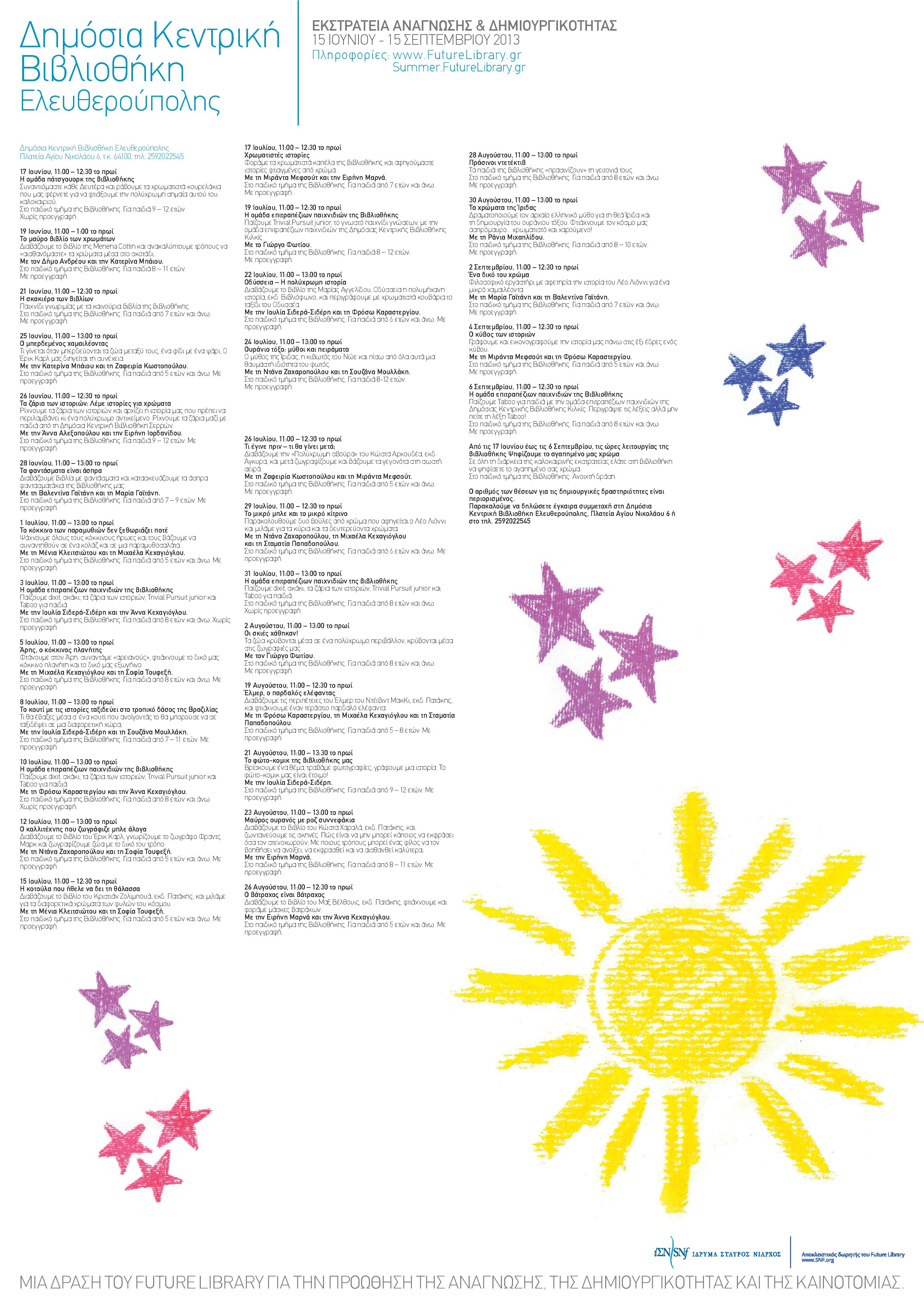 Από τις 17 Ιουνίου έως τις 6 Σεπτεμβρίου, το παιδικό τμήμα της Βιβλιοθήκης θα γίνει ο χώρος συνάντησης των παιδιών της ευρύτερης περιοχής της Ελευθερούπολης και της Καβάλας. Οι μικροί βιβλιόφιλοι θα έχουν την ευκαιρία να συμμετέχουν σε αφηγήσεις ιστοριών, εικαστικά εργαστήρια, δραματοποιήσεις παραμυθιών και ιστοριών, πειράματα και γενικότερα σε δράσεις που ενθαρρύνουν και καλλιεργούν τη δημιουργική έκφραση. Επιπλέον, θα υπάρχουν δράσεις όπου τα παιδιά θα παίζουν επιτραπέζια παιχνίδια και μάλιστα κάποιες φορές με παιδιά από άλλες βιβλιοθήκες, μέσω skype! Η είσοδος σε όλες τις εκδηλώσεις είναι δωρεάν, αλλά θα τηρείται σειρά προτεραιότητας σε περίπτωση που η προσέλευση είναι πολύ μεγάλη. Οι εκδηλώσεις πραγματοποιούνται με την αμέριστη βοήθεια εμψυχωτών που συμμετέχουν εθελοντικά.