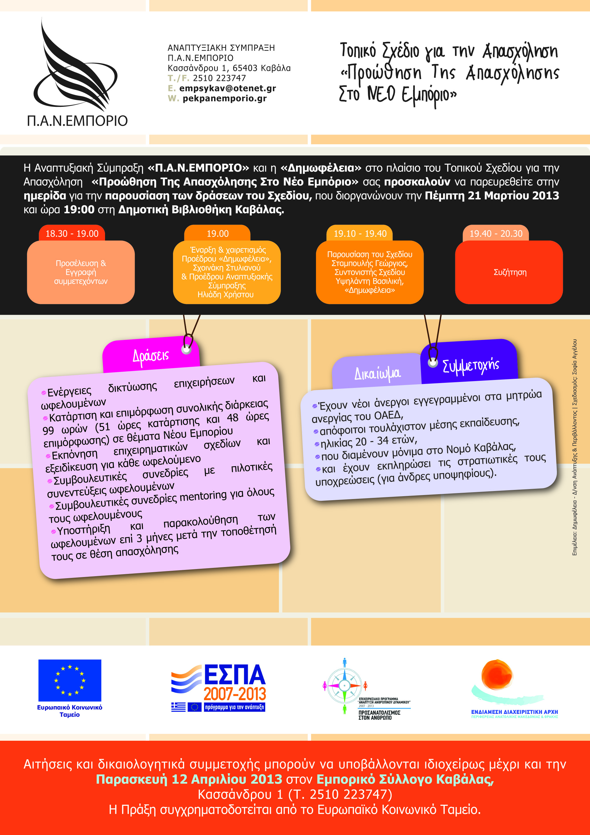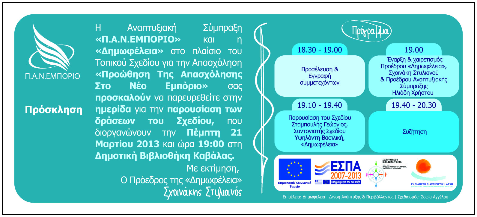 Ο Εμπορικός Σύλλογος Καβάλας, ως Συντονιστής Εταίρος της Αναπτυξιακής Σύμπραξης «Π.Α.Ν.ΕΜΠΟΡΙΟ», και η «Δημωφέλεια», ως Εταίρος του