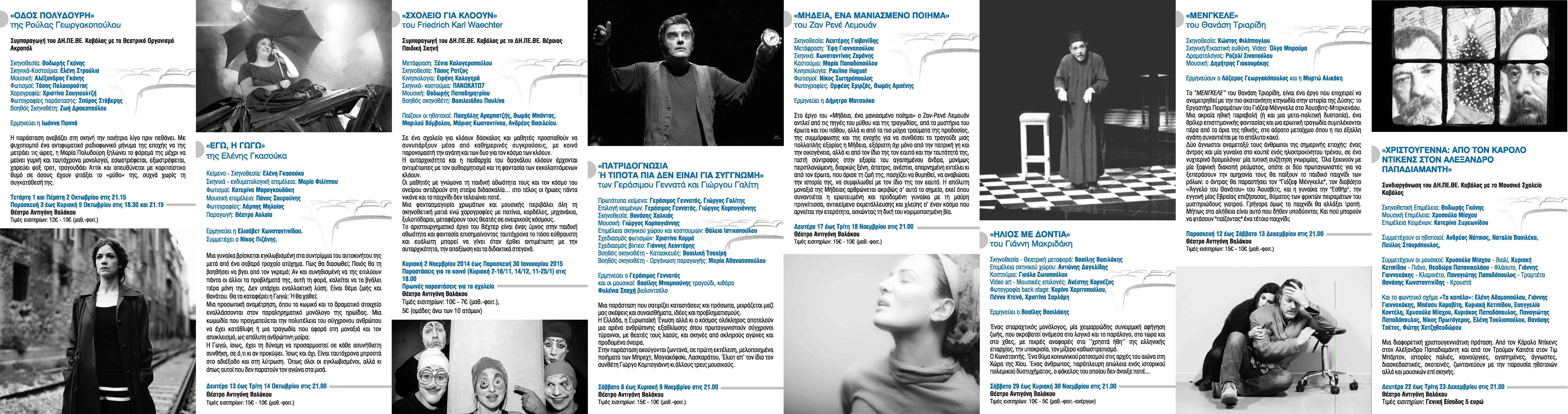 Την αυλαία στην πρώτη περίοδο του χειμερινού προγράμματος άνοιξε την 1η Οκτωβρίου 2014, ο μονόλογος «Οδός Πολυδούρη», της Ρούλας Γεωργακοπούλου, με την ηθοποιό, Ιωάννα Παππά.
