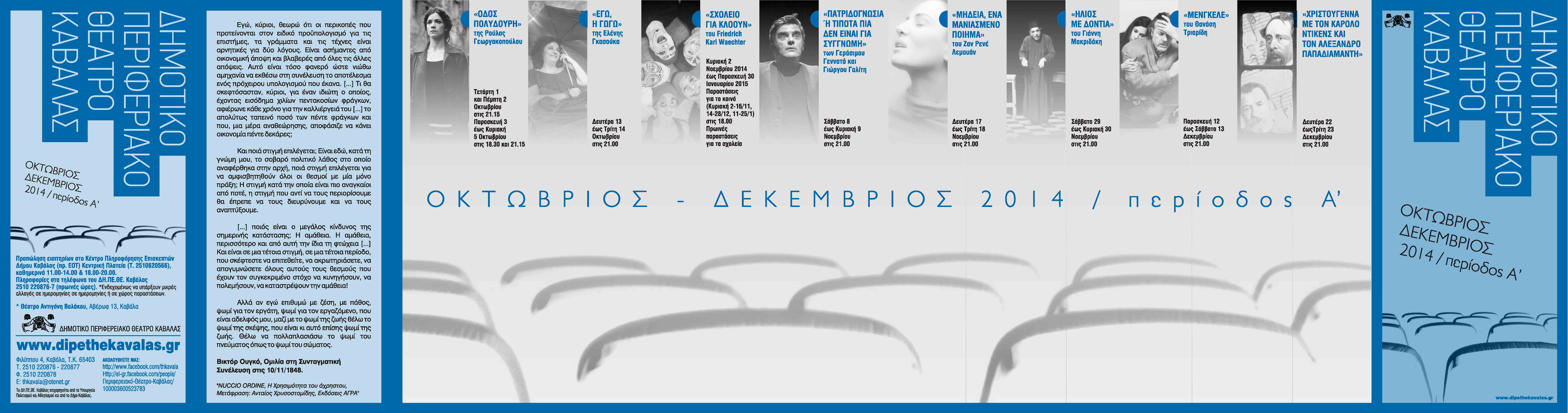 Ένα θεατρικό τρίμηνο, από τον Οκτώβριο έως τον Δεκέμβριο, ετοίμασε για να ψυχαγωγήσει τους Καβαλιώτες και τις Καβαλιώτισσες, αλλά και τους πολίτες των γειτονικών πόλεων και περιοχών, το Δημοτικό Περιφερειακό Θέατρο (ΔΗ.ΠΕ.ΘΕ.) Καβάλας.