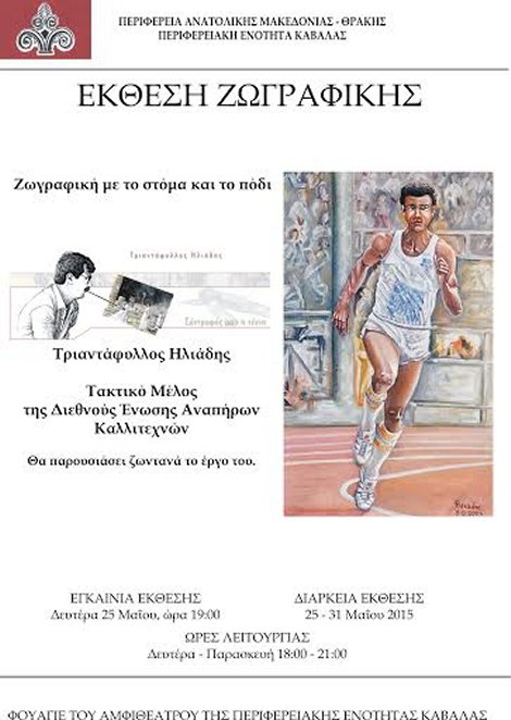 Τη Δευτέρα 25 Μαΐου 2015 και ώρα 19:00, στο φουαγιέ του αμφιθεάτρου της Περιφερειακής Ενότητας Καβάλας, θα πραγματοποιηθούν τα εγκαίνια της έκθεσης με θέμα: «Ζωγραφική με το στόμα και το πόδι», του Τριαντάφυλλου Ηλιάδη, τακτικού μέλους της Διεθνούς Ένωσης Αναπήρων Καλλιτεχνών με το Στόμα και το Πόδι, ο οποίος θα παρουσιάσει ζωντανά το έργο του.