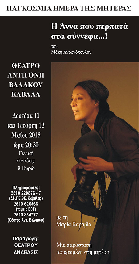 Το ΔΗ.ΠΕ.ΘΕ. Καβάλας φιλοξενεί τη Δευτέρα 11 και την Τετάρτη 13 Μαΐου, στο θέατρο Αντιγόνη Βαλάκου, την Εταιρεία «Θεάτρου Ανάβασις» με το έργο του Μάκη Αντωνόπουλου «Η Άννα που περπατά στα σύννεφα..!» σε σκηνοθεσία Μαρίας Καραβία.