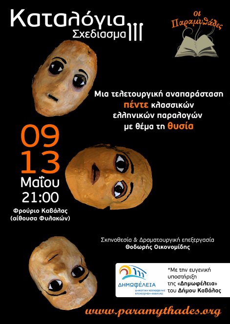 Στην τελική ευθεία βρίσκεται η προετοιμασία της θεατρικής παράστασης Καταλόγια …Σχεδίασμα ΙΙΙ. Η παράσταση είναι το αποτέλεσμα ενός εξάμηνου εργαστηρίου- training με θέμα την Έρευνα πάνω στις Παραλογές, που παρακολούθησε μέρος των μελών των Παραμυθάδων – της ομάδας μελέτης, διατήρησης και διάδοσης του λαϊκού παραμυθιού και παιχνιδιού-, με εισηγητή τον σκηνοθέτη Θοδωρή Οικονομίδη. Ο Θοδωρής Οικονομίδης είναι κάτοχος Διπλώματος της Κρατικής Δραματικής Σχολής του Κ.Θ.Β.Ε., με πολυετή πείρα στην σκηνοθεσία, την υποκριτική και την διδασκαλία Θεάτρου. Έχει συνεργαστεί με το ΚΘΒΕ και το Εθνικό Θέατρο και έχει συμμετάσχει στο Φεστιβάλ Αθηνών και Επιδαύρου και άλλα Διεθνή Φεστιβάλ (Καναδά, Φιλανδία, Ιαπωνία, Ρουμανία, Πολωνία… κ.α.)