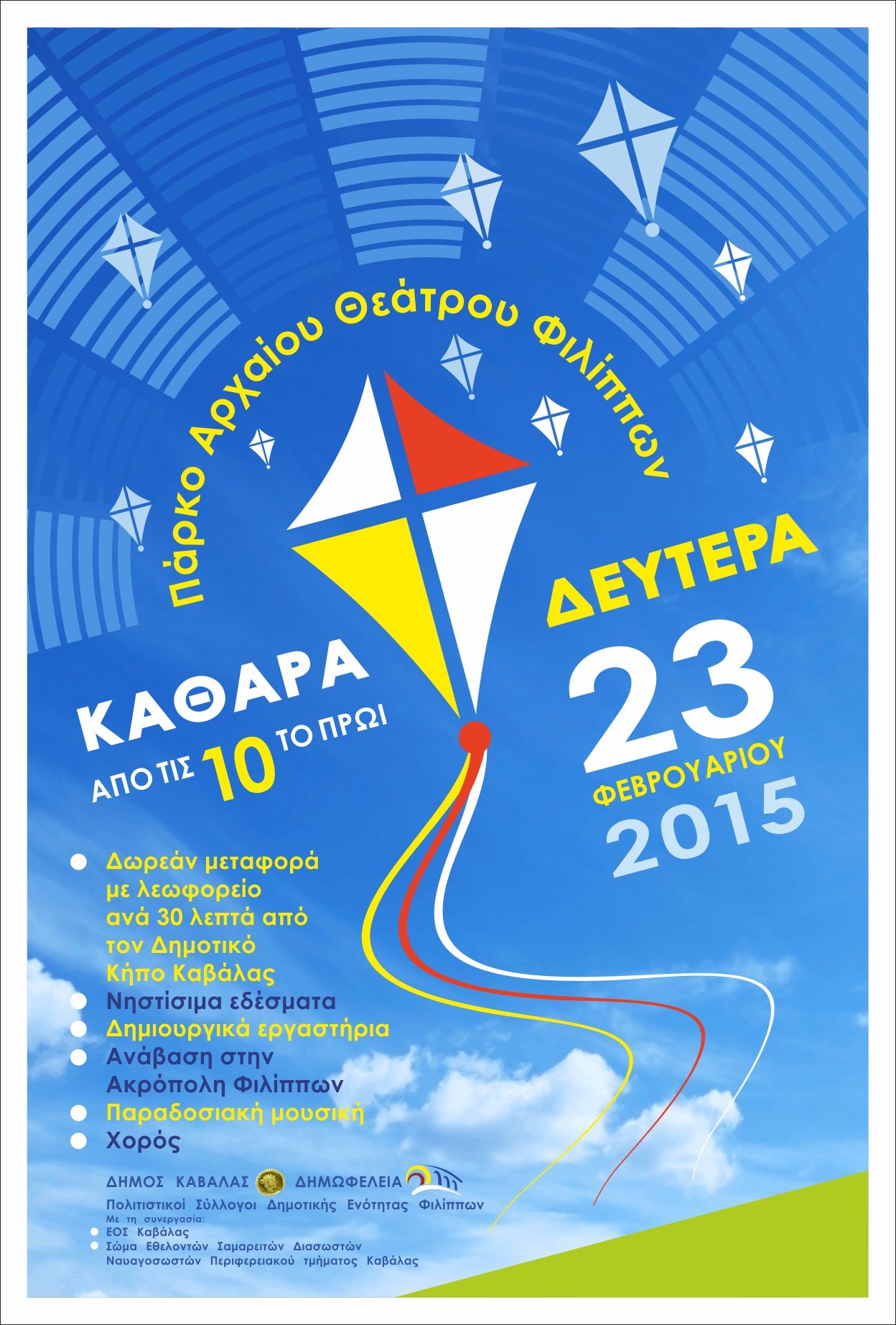 Ο Δήμος Καβάλας και η Δημοτική Κοινωφελής Επιχείρηση Δημωφέλεια σας προσκαλούν στον εορτασμό της Καθαράς Δευτέρας στις 23/02/2015 που θα πραγματοποιηθεί στο Πάρκο Αρχαίου Θεάτρου Φιλίππων.