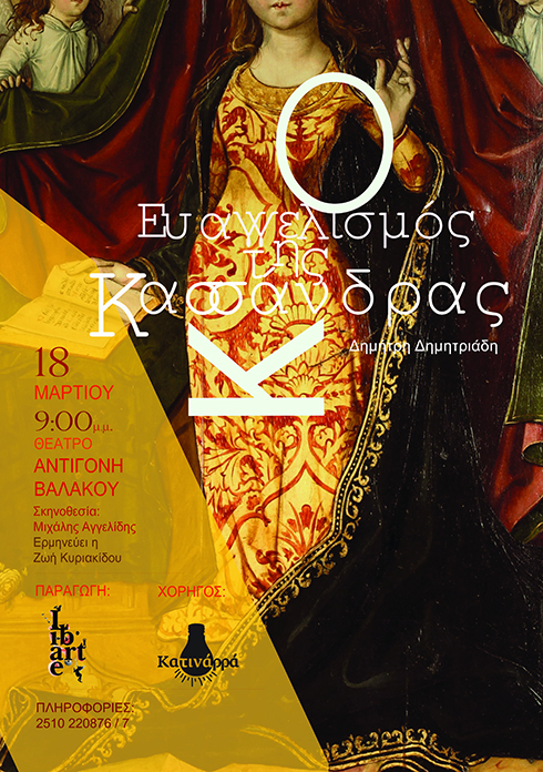 Το ΔΗ.ΠΕ.ΘΕ. Καβάλας φιλοξενεί την Τετάρτη 18 Μαρτίου, στο θέατρο Αντιγόνη Βαλάκου, την Εταιρεία «Libarte» με το έργο του Δημήτρη Δημητριάδη «Ο Ευαγγελισμός της Κασσάνδρας» σε σκηνοθεσία του Καβαλιώτη Μιχάλη Αγγελίδη.