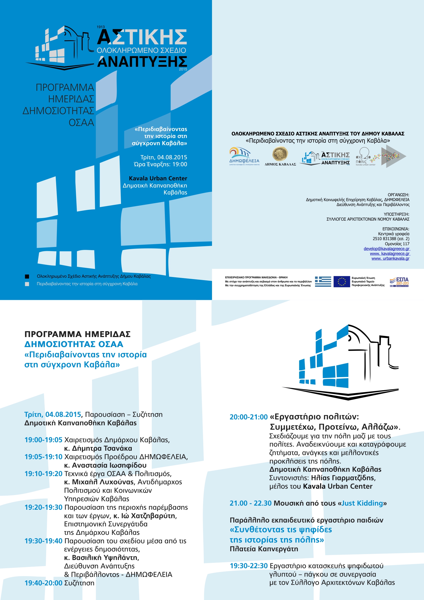 Ο Δήμος Καβάλας και η Δημοτική Κοινωφελής Επιχείρηση Καβάλας ΔΗΜΩΦΕΛΕΙΑ σε συνεργασία με το Σύλλογο Αρχιτεκτόνων Καβάλας, στο πλαίσιο υλοποίησης της Πράξης «Ενέργειες για τη δημοσιότητα & την ευαισθητοποίηση για το Ολοκληρωμένο Σχέδιο Αστικής Ανάπτυξης (ΟΣΑΑ) του Δήμου Καβάλας», διοργανώνουν: