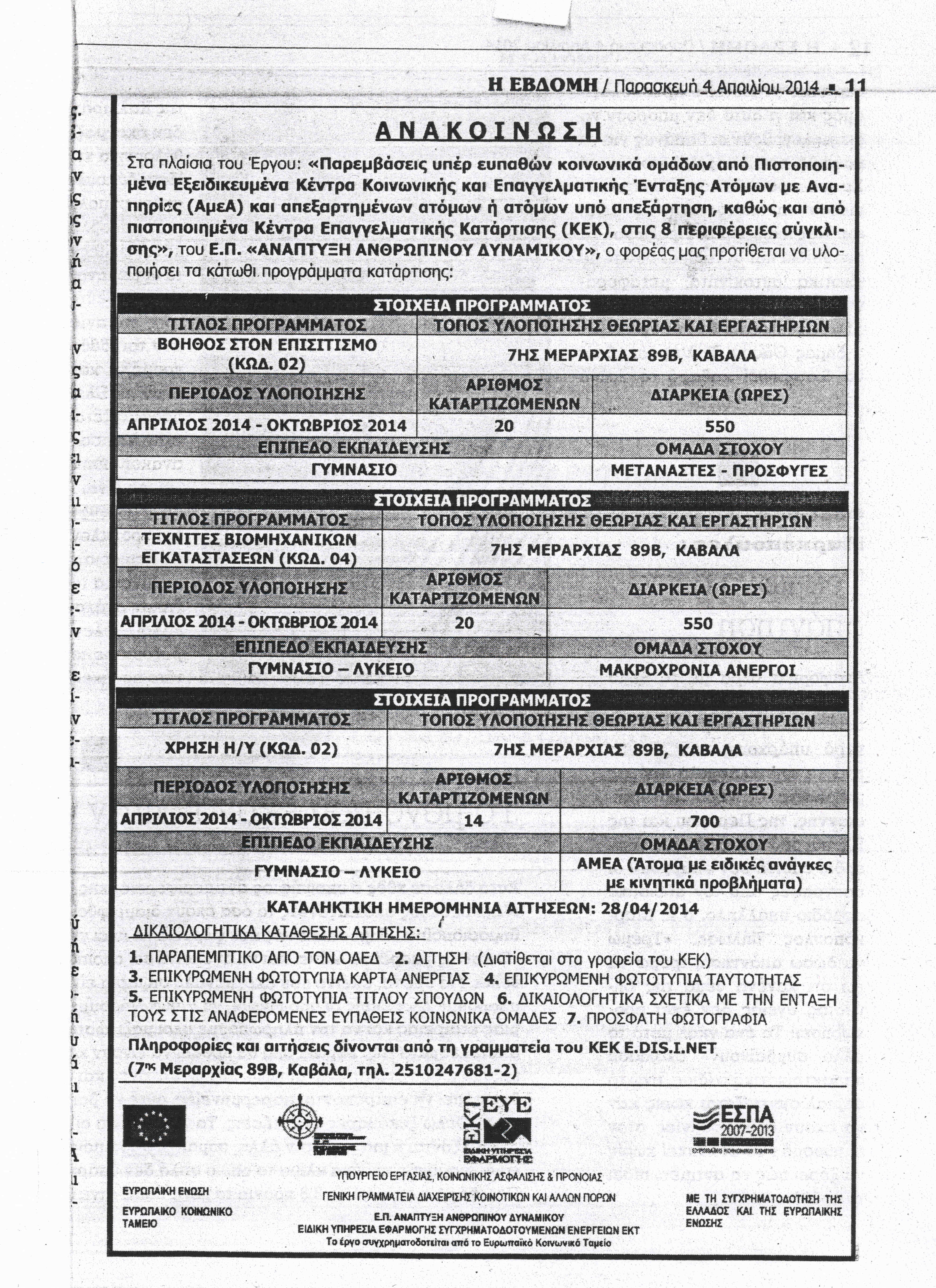 Στα πλαίσια του Έργου : «Παρεμβάσεις υπέρ ευπαθών κοινωνικά ομάδων από Πιστοποιημένα Εξειδικευμένα Κέντρα Κοινωνικής και Επαγγελματικής Ένταξης Ατόμων με Αναπηρίες (ΑμεΑ) και απεξαρτημένων ατόμων ή ατόμων υπό απεξάρτηση, καθώς και από πιστοποιημένα Κέντρα Επαγγελματικής Κατάρτισης (ΚΕΚ), στις 8 περιφέρειες σύγκλισης», του Ε.Π. «ΑΝΑΠΤΥΞΗ ΑΝΘΡΩΠΙΝΟΥ ΔΥΝΑΜΙΚΟΥ», ο φορέας μας προτίθεται να υλοποιήσει τα κάτωθι προγράμματα κατάρτισης.