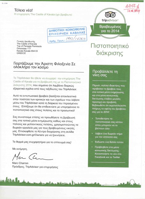 Τη βράβευση και την απόδοση σχετικού Πιστοποιητικού Διάκρισης γνωστοποίησε ο πρόεδρος της ιστοσελίδας ΤripΑdvisor για επιχειρήσεις Marc Charron με σχετική επιστολή του στη διεύθυνση της Δημοτικής Κοινωφελούς Επιχείρησης του Δήμου Καβάλας «ΔΗΜΩΦΕΛΕΙΑ»