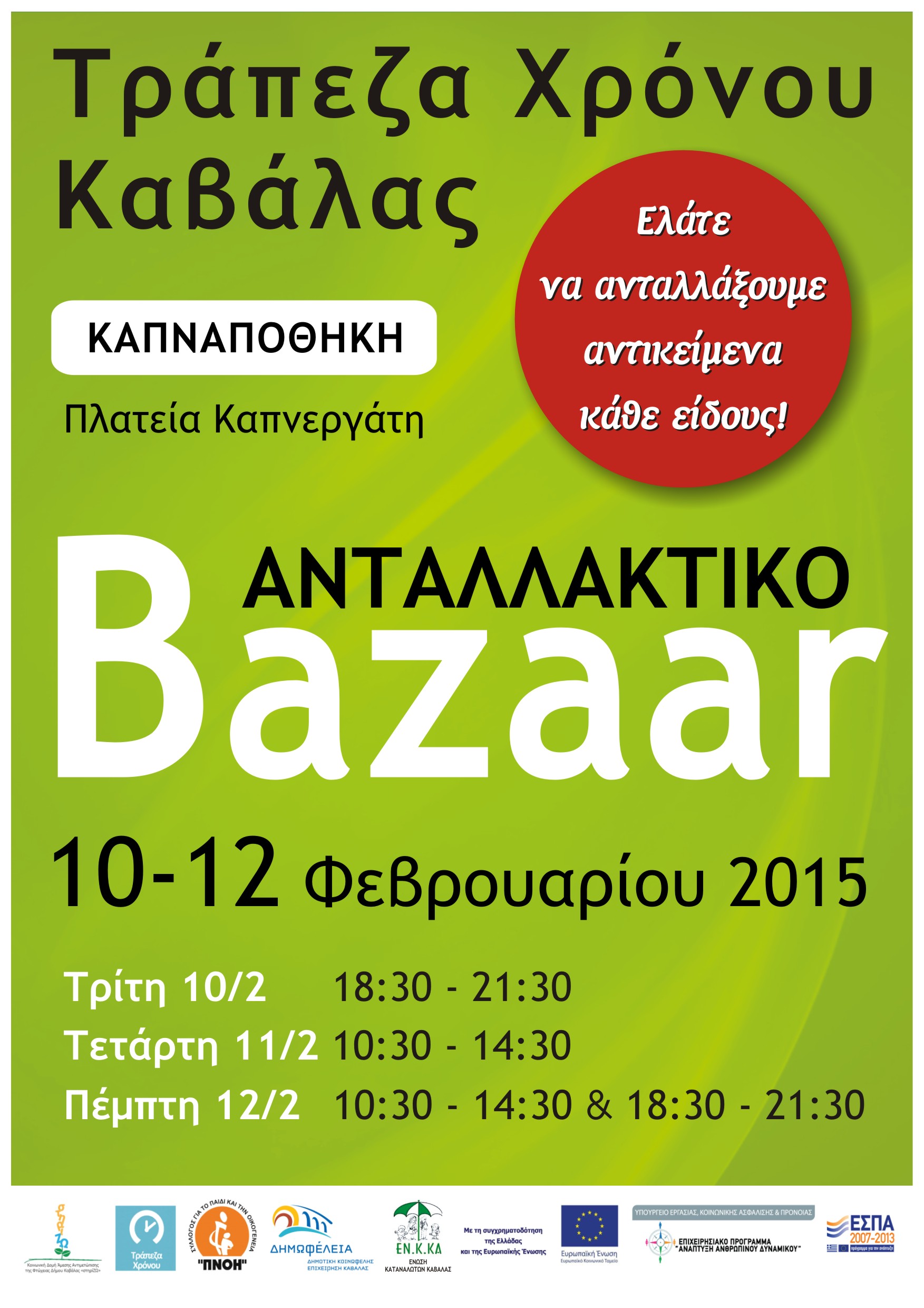 σας προσκαλεί στο «Τριήμερο Ανταλλακτικό Βazaar» που διοργανώνει στην Καπναποθήκη (Πλατεία Καπνεργάτη), στις παρακάτω ημέρες και ώρες: