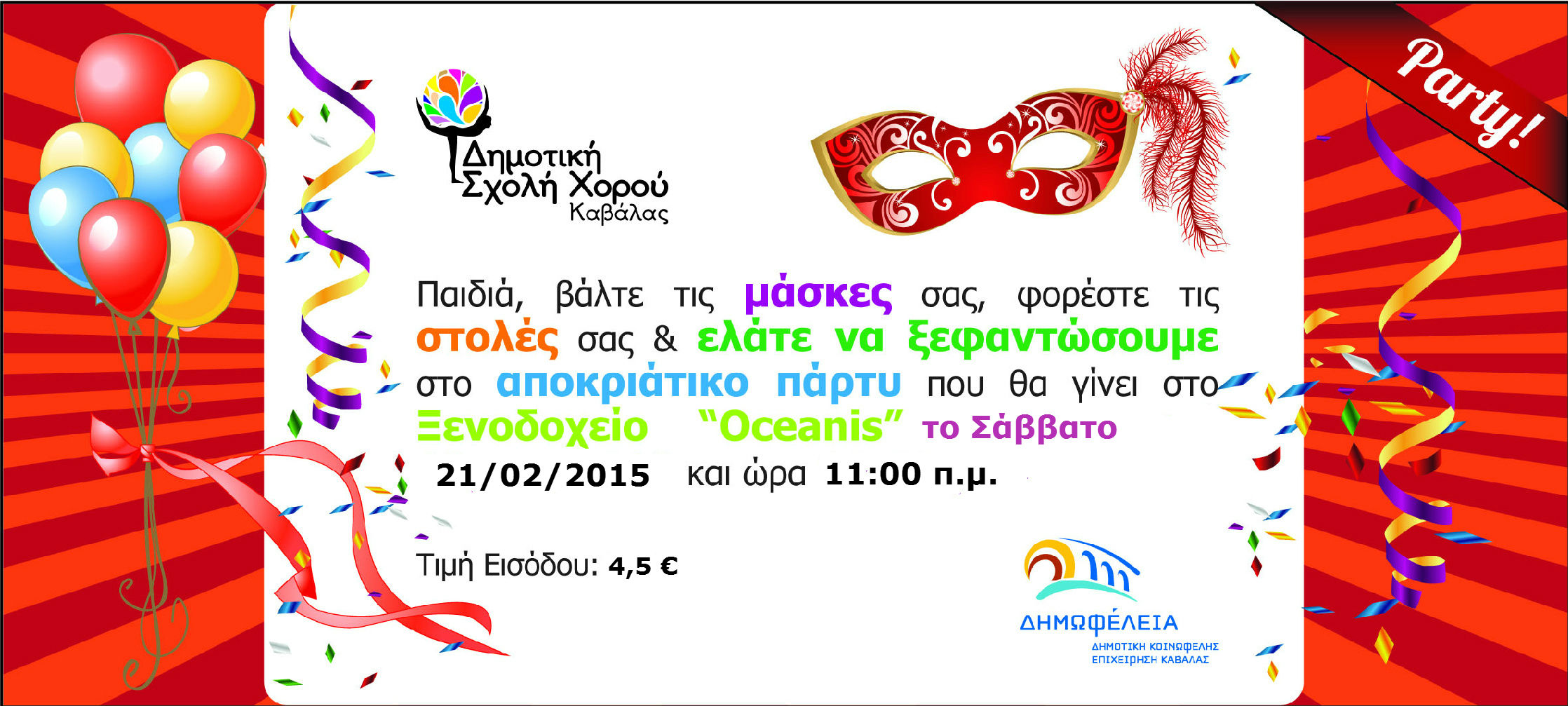 Η Δημοτική Σχολή Χορού Καβάλας σας προσκαλεί στο αποκριάτικο πάρτι που διοργανώνει, στο ξενοδοχείο “Oceanis” ,