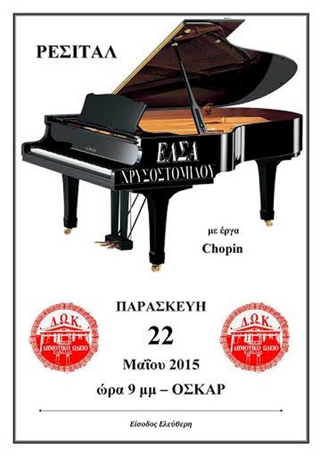 Tην Παρασκευή 22 Μαΐου 2015 στις 9 το βράδυ στο ΟΣΚΑΡ, το Δημοτικό Ωδείο Καβάλας (Δ.Ω.Κ.) διοργανώνει ένα ιδιαίτερα ενδιαφέρον ρεσιτάλ πιάνου, με την διακεκριμένη Καβαλιώτισσα πιανίστα, Έλσα Χρυσοστομίδου, σε έργα του Frederic Chopin. Η καλλιτέχνιδα έχει δώσει ατομικά ρεσιτάλ και έχει εμφανιστεί σε συναυλίες μουσικής δωματίου στην Ελλάδα και στη Γερμανία. Άρχισε τις σπουδές της στο Δημοτικό Ωδείο Καβάλας. Συμμετείχε σε πολλά σεμινάρια του ζεύγους Πολυζωΐδη και του ζεύγους Ganev, όπως και των: Vitaly Margulis, Μαρτίνου Τιρίμου, Γιάννη Βακαρέλη. Επίσης, παρακολούθησε μαθήματα με την Δόμνα Ευνουχίδου και τον Georg Sava, καθηγητή της Μουσικής Ακαδημίας του Βερολίνου.