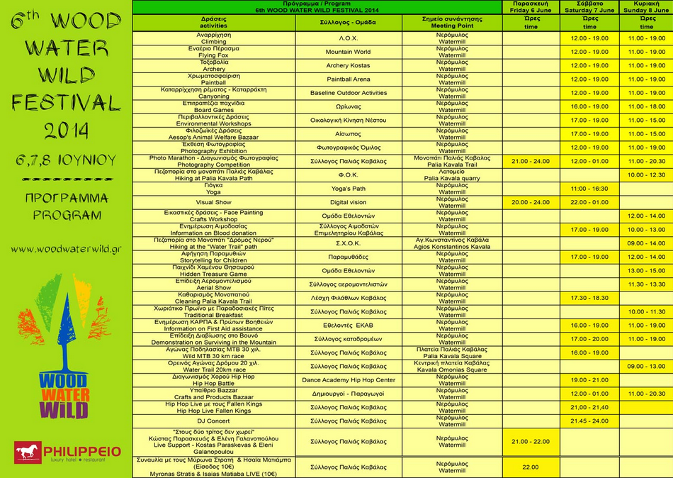 Λίγες ημέρες έμειναν για το 6ο φεστιβάλ Wood Water Wild, το οποίο θα διεξαχθεί στον μαγικό χώρο του παλιού νερόμυλου στην Παλιά Καβάλα από τις 6 ως τις 8 Ιουνίου, και οι προετοιμασίες συνεχίζονται με έντονους ρυθμούς. Τόσο οι διοργανωτές όσο και οι εθελοντές βρίσκονται κυριολεκτικά επί ποδός πολέμου για να τακτοποιήσουν και τις τελευταίες λεπτομέρειες προκειμένου τα πάντα να είναι στην εντέλεια. Ήδη, μάλιστα, έχει αναρτηθεί σε πολλά μέρη της Καβάλας (άλλα και στην Ελευθερούπολη, Χρυσούπολη και στην Δράμα) η αφίσα του event, ενώ πλέον έχει οριστεί και το τελικό πρόγραμμα του φεστιβάλ.